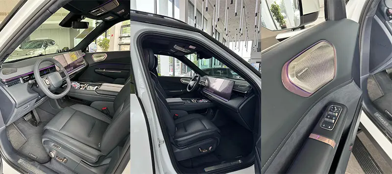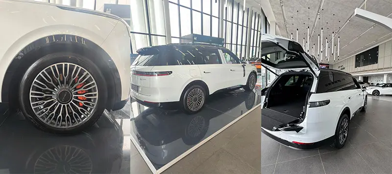 Entering the car, the first impression is one of spaciousness and luxury. The center console features a layered structure with a combination of dark and light fabrics, and detailed chrome trim adds a touch of luxury. The 12.66-inch embedded instrument panel paired with a 30-inch 6K display offers smooth operation and clear display. The car's system is equipped with the LYNK Flyme Auto intelligent connectivity system, supporting four mobile phone ecosystems for exceptional user experience. The seats are made of thick, soft Nappa leather, and the second-row legroom offers up to 1.2 meters. With the three rows folded, the trunk expands from 225 liters to 1070 liters, ensuring comfortable luggage storage for family outings.